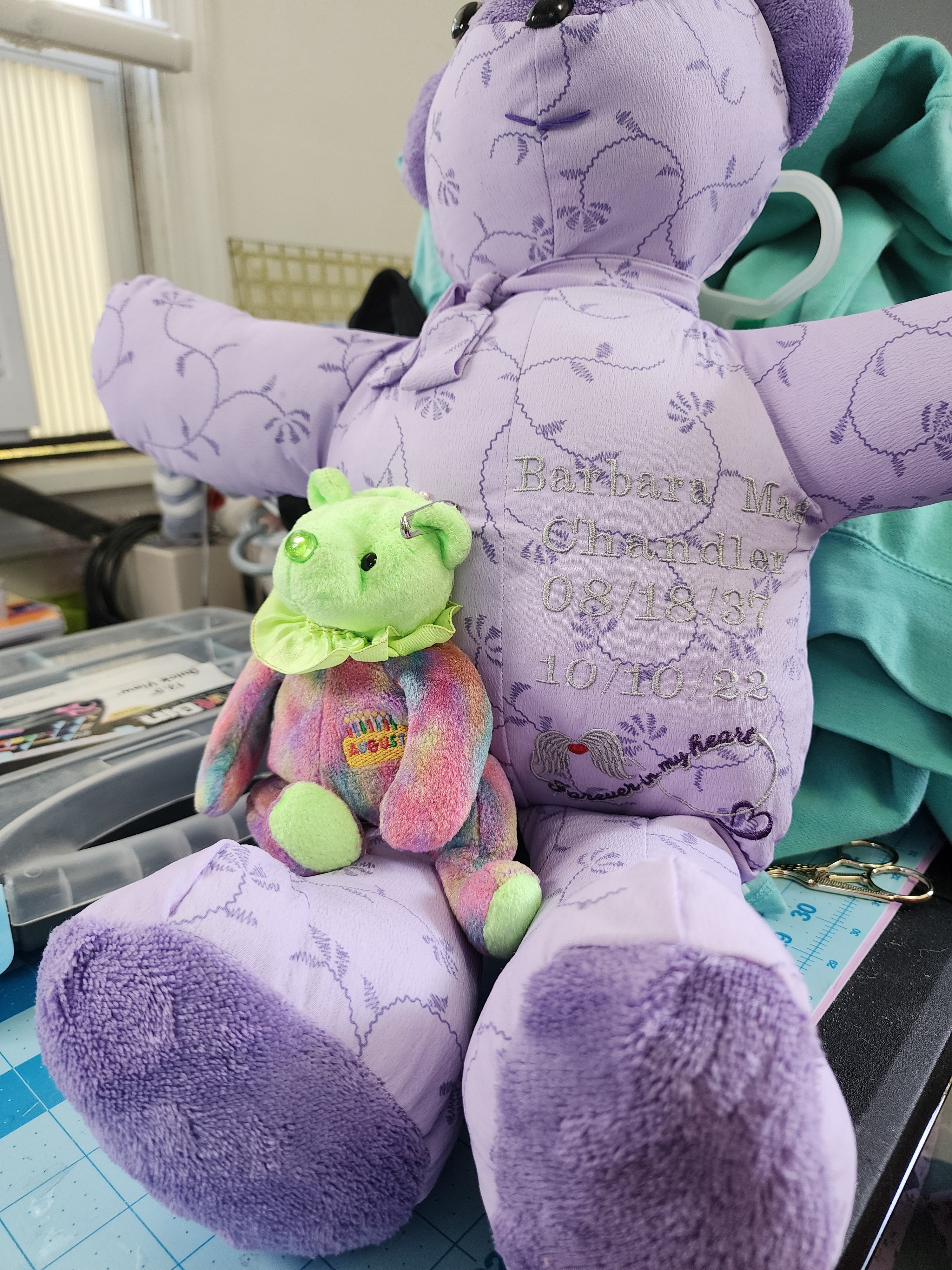 This bear means a lot to me. It was made from one of my grandmother's favorite church dresses. I attached the Beanie Baby because it belonged to her and represents her birth month.