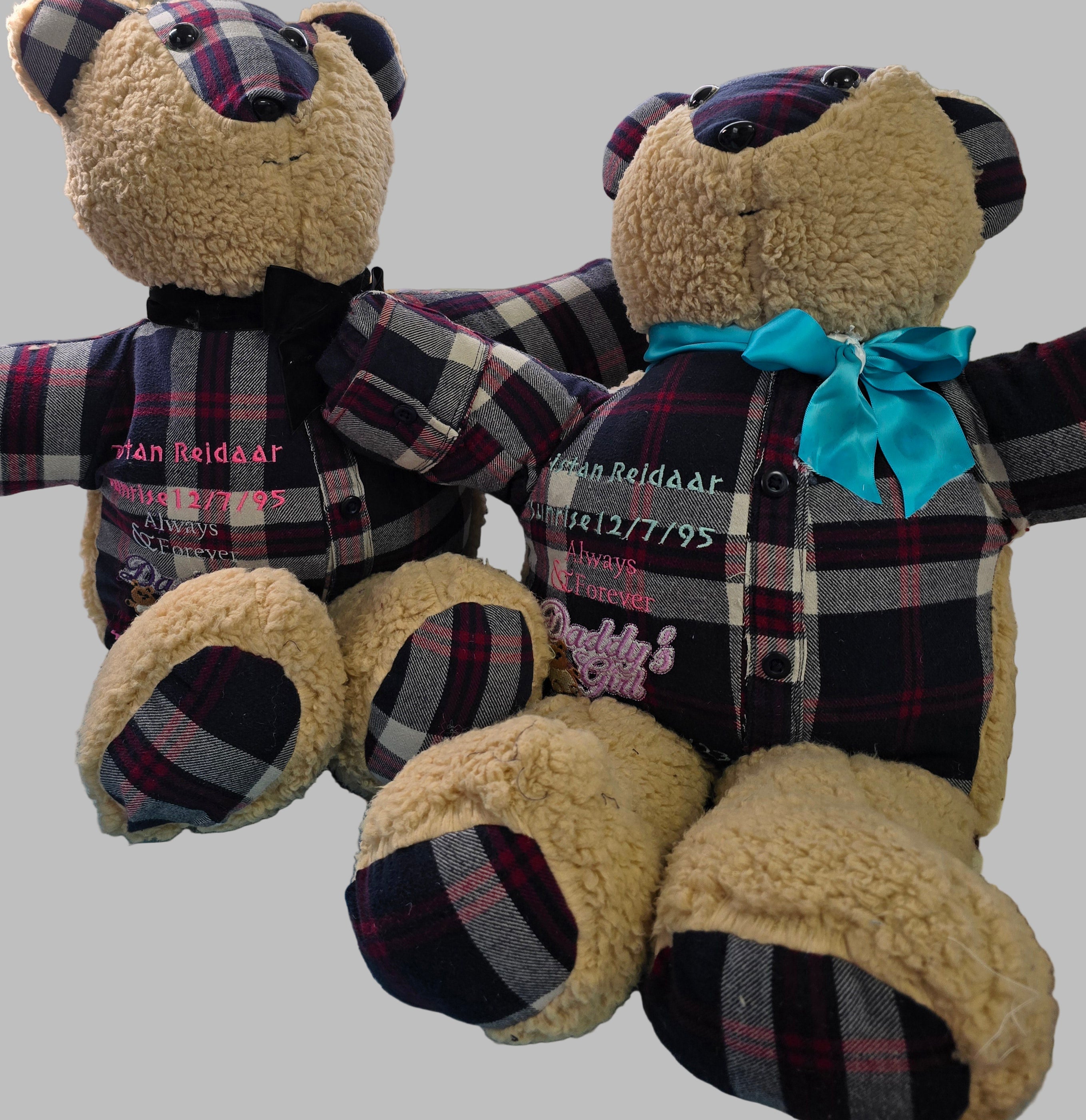 A customer who recently lost her husband requested bears to be made for her little girls. I included as much of the shirt as possible, using the pockets, cuffs, and buttons to add more detail.