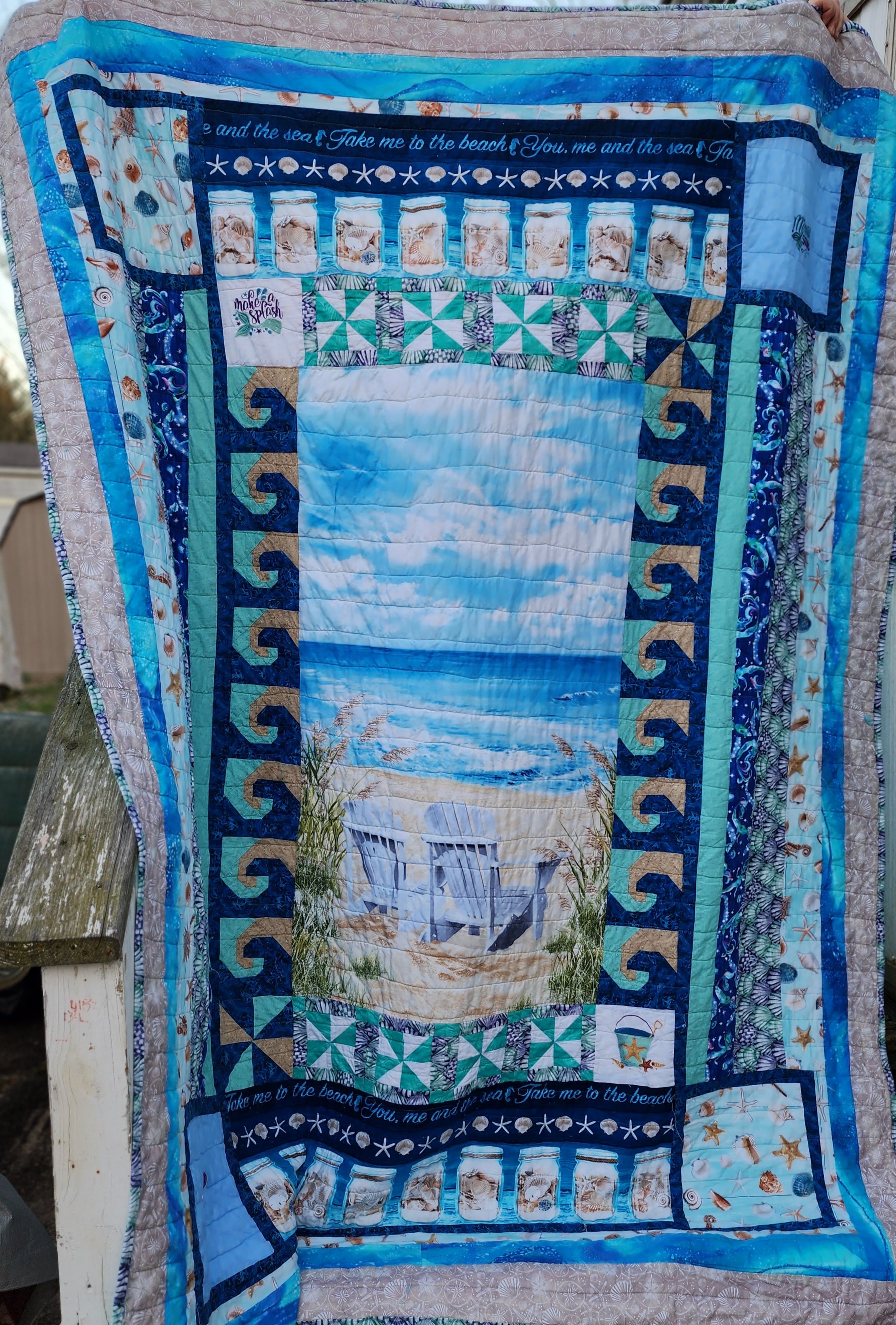 I made a beach-themed quilt for my aunt. This queen-sized quilt features several embroidered pictures, a beach panel, and numerous machine-pieced blocks.