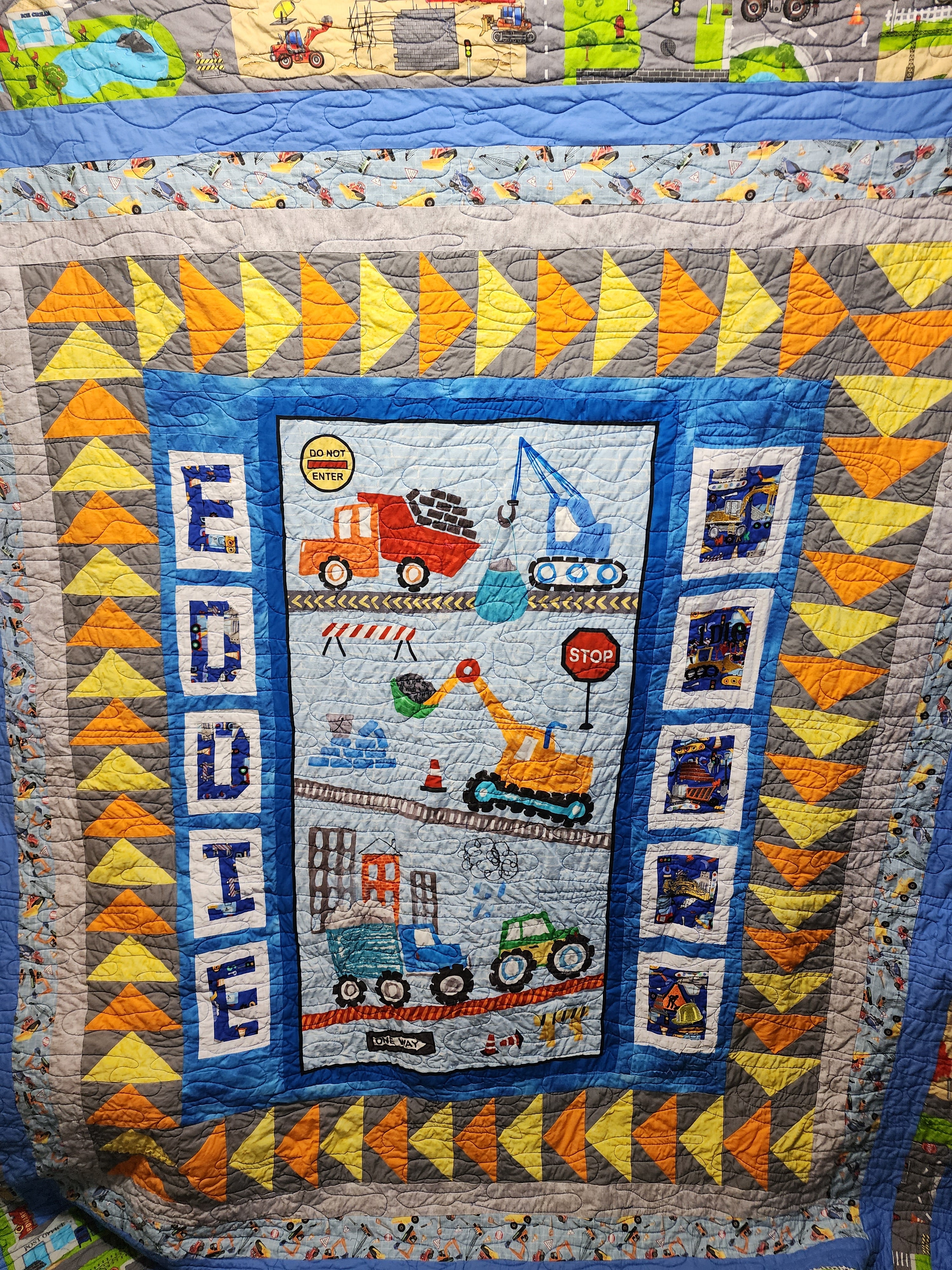 I made a quilt for a friend; it was her son's big boy bed blanket. Featuring letter blocks for his name the other side features embroidered truck, the middle is a quilt panel.