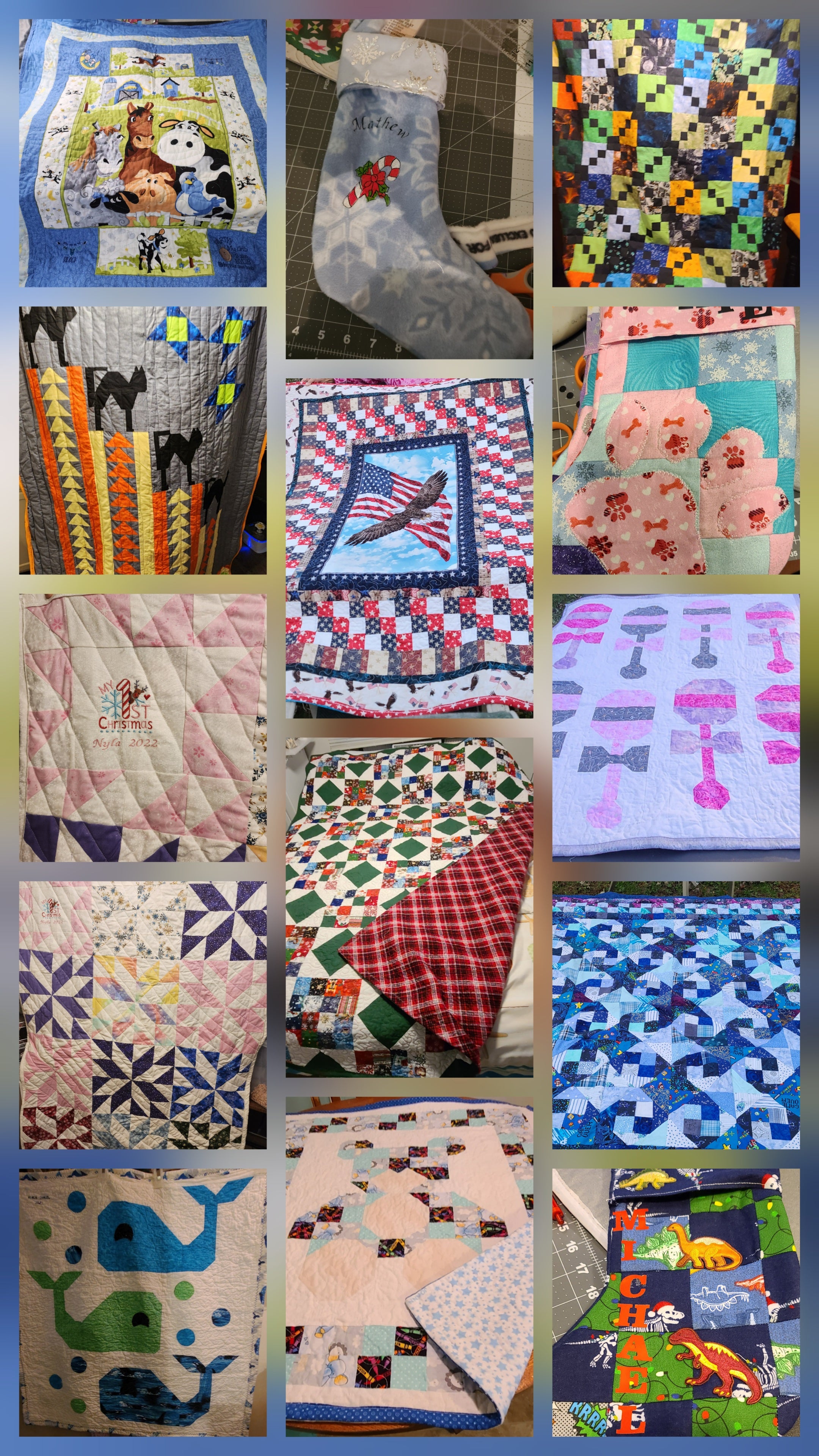 This collage showcases quilts, Christmas stockings, and baby quilts that I have created in the past.