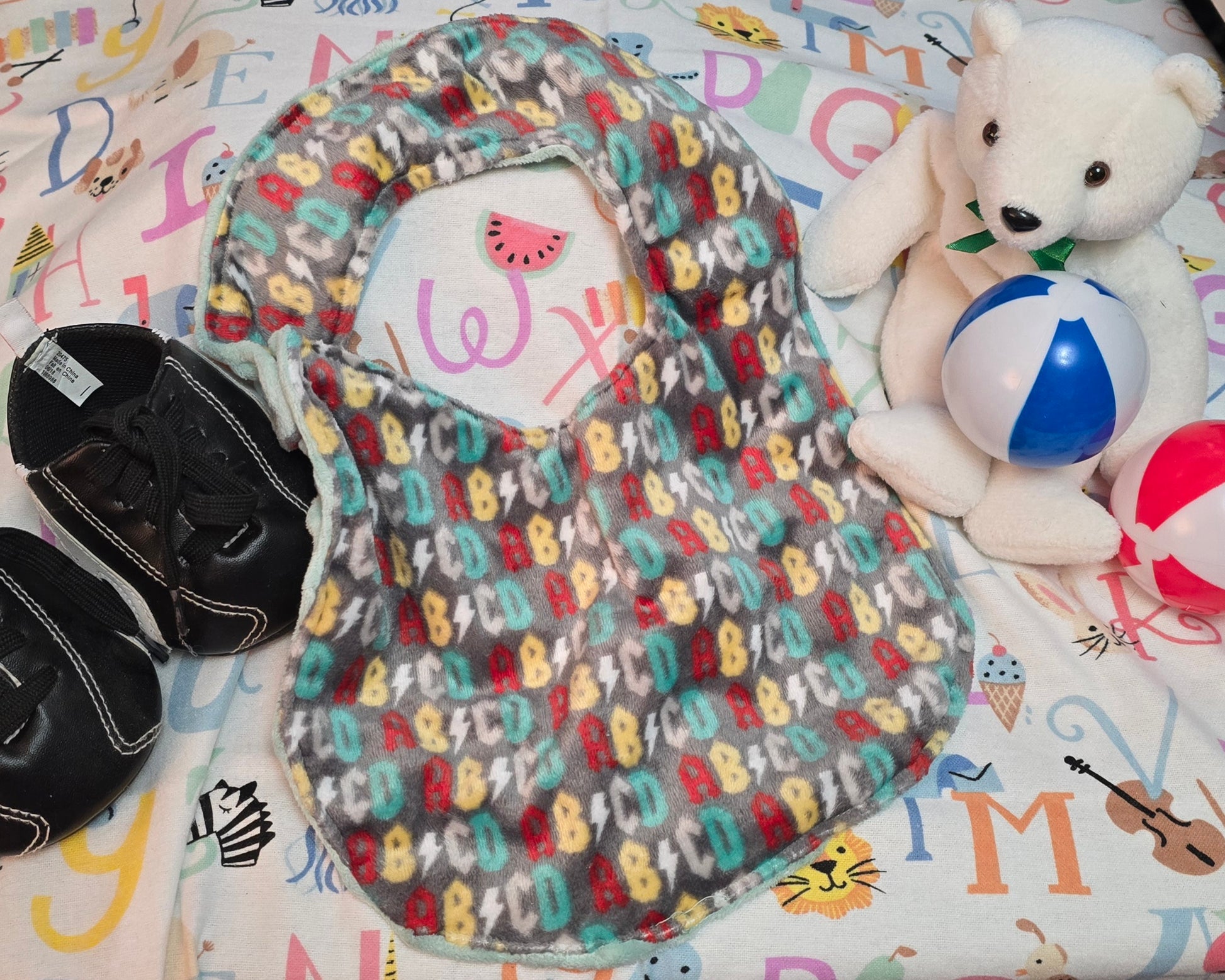 Reversible baby bibs come in three sizes: 0-3 months, 3-6 months, and 6 months and up. The bibs are soft and comfortable, ensuring they won't scratch a baby's skin, and they feature a plastic snap button that won't rust.