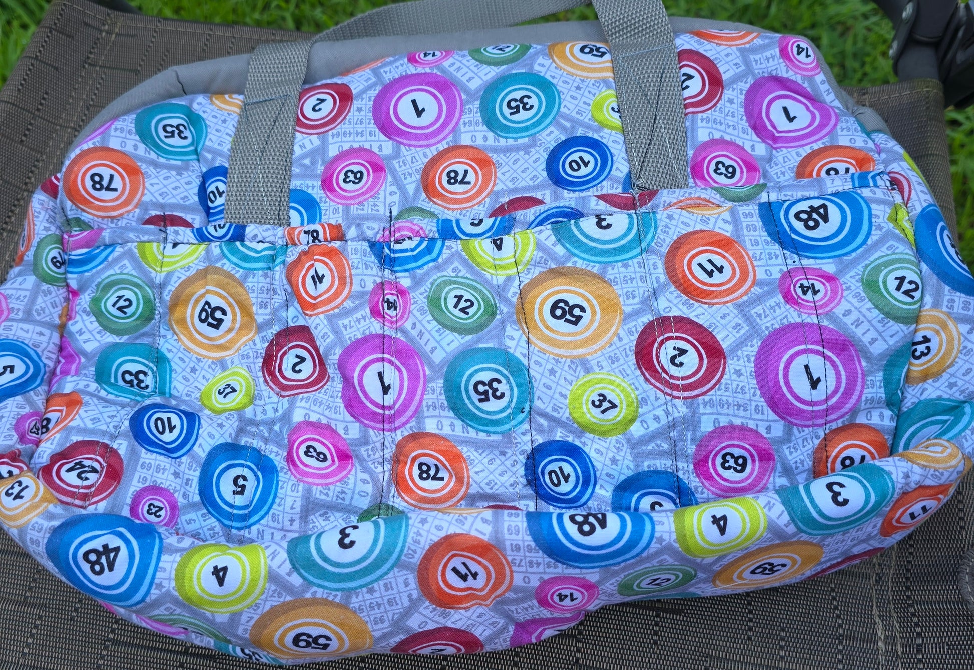 Calling bingo, or in my case f***!!! This bag is sturdy enough to maintain its shape, features a zipper at the top to secure your belongings, and has three pockets in the back for your dabbers. Measurements are approximately 14x9x5.