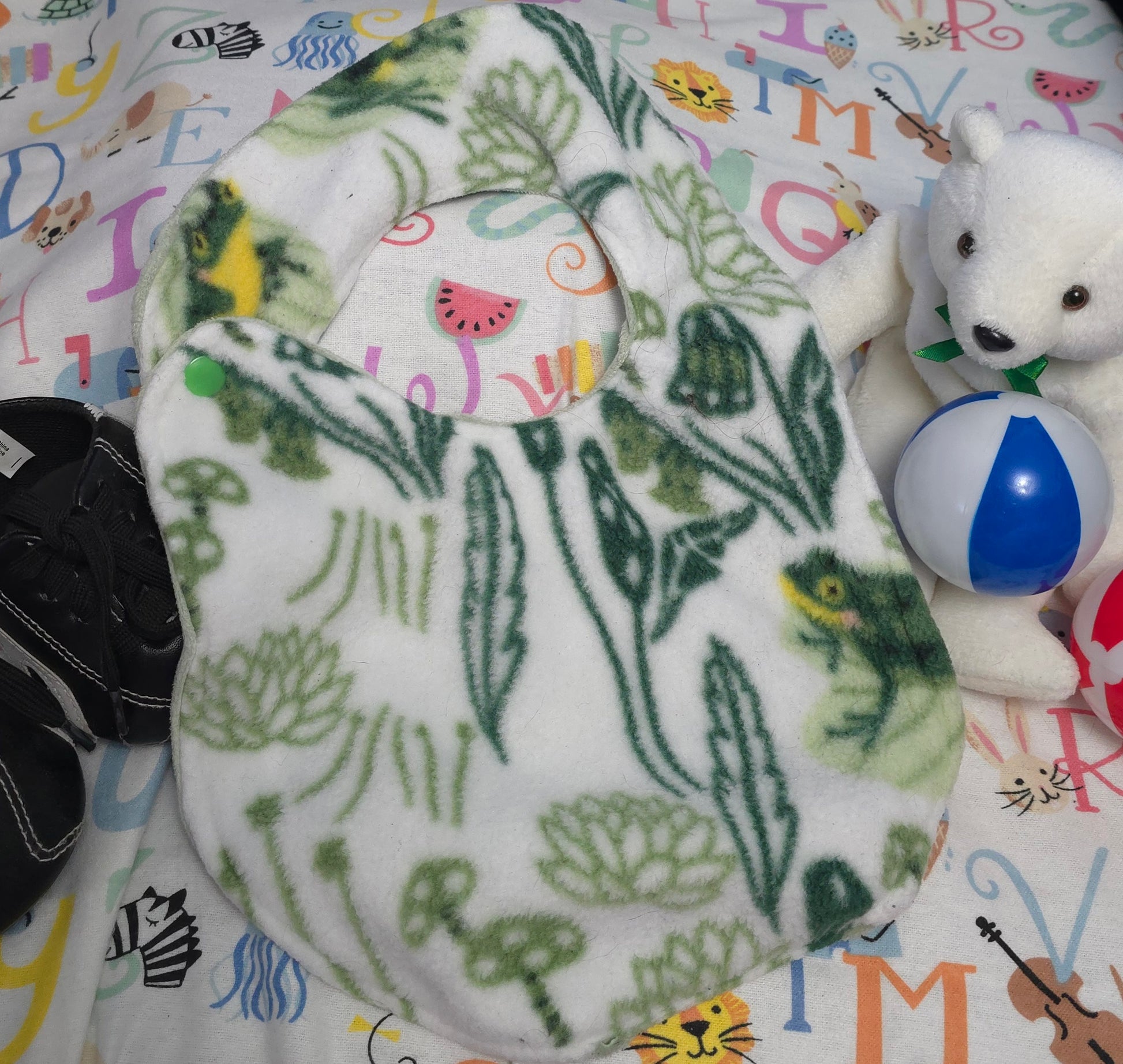 Reversible baby bibs come in three sizes: 0-3 months, 3-6 months, and 6 months and up. The bibs are soft and comfortable, ensuring they won't scratch a baby's skin, and they feature a plastic snap button that won't rust.