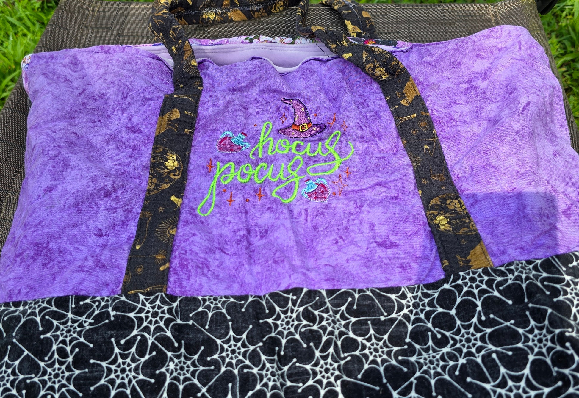 Hocus Pocus The bag measures 18"W x 12"H and does not include pockets or closures.